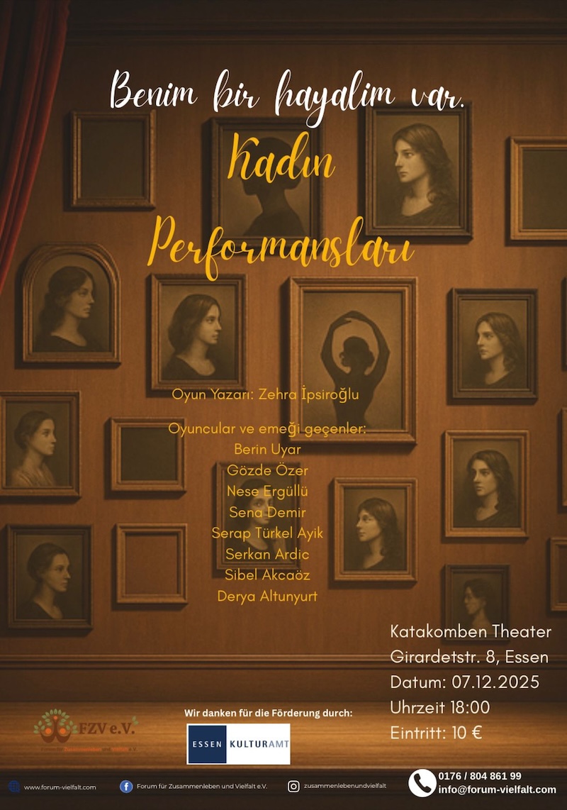 Dieses besondere Theaterprojekt wird vom Forum für Zusammenleben und Vielfalt e. V. umgesetzt und zeigt Frauen auf der Bühne, die zuvor noch nie gespielt haben. Jede von ihnen hat aktiv mitgewirkt und ihre Geschichten eingebracht. Das Projekt wird vom Kulturamt der Stadt Essen gefördert